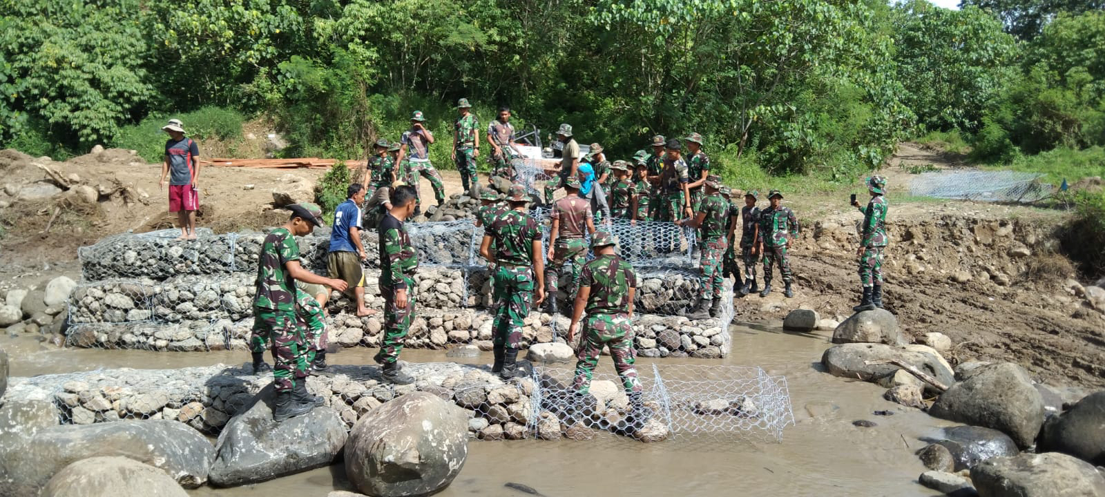 BN Online ; Redelong -Personel Satuan Tugas (Satgas) mulai membangun Jembatan yang menjadi sasaran fisik pada program TMMD di Desa Negeri Antara Kecamatan Pintu Rime Gayo Kabupaten Bener Meriah. Rabu 25 Mei 2022.
